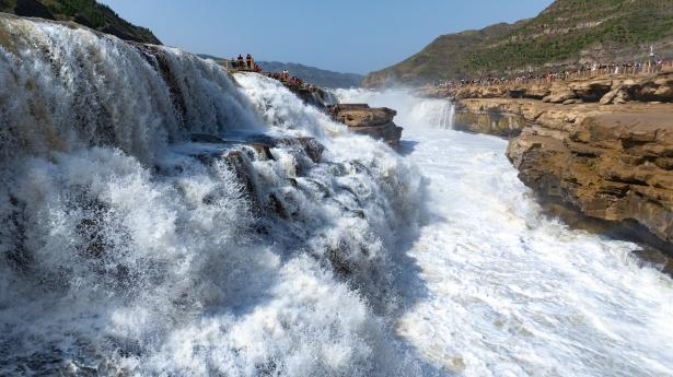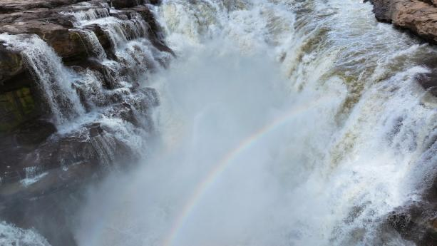 进入五月,位于秦晋大峡谷的陕西黄河壶口瀑布水流落差增大,激流澎湃,此时的黄河壶口瀑布水流由浊变清,呈现出“清瀑飞流”的壮美景观。滚滚黄河水奔流入百尺之峡,声如奔雷,澎湃咆哮溅起数米高的水雾,在阳光的照射下,飞瀑与彩虹相映,景色壮美。